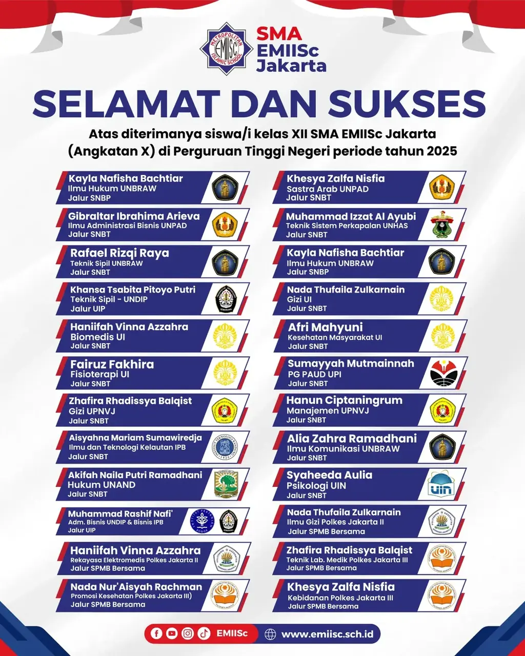 Selamat & Sukses! Kami ucapkan selamat kepada siswa-siswi SMA EMIISc Jakarta yang telah diterima di Perguruan Tinggi Negeri tahun ini! ⠀ Kerja keras, doa, dan semangat belajar kalian telah membuahkan hasil. Teruslah menimba ilmu, menginspirasi, dan membawa nama baik EMIISC di manapun kalian berada. Barakallahufiikum